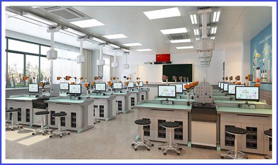 实验室共八间,配备国内先进的实验室吊装系统、实验录播系统、云智慧管理系统、实验3D动画资源库、实验硬件等,实验桌配有可升降的考试系统挡板。