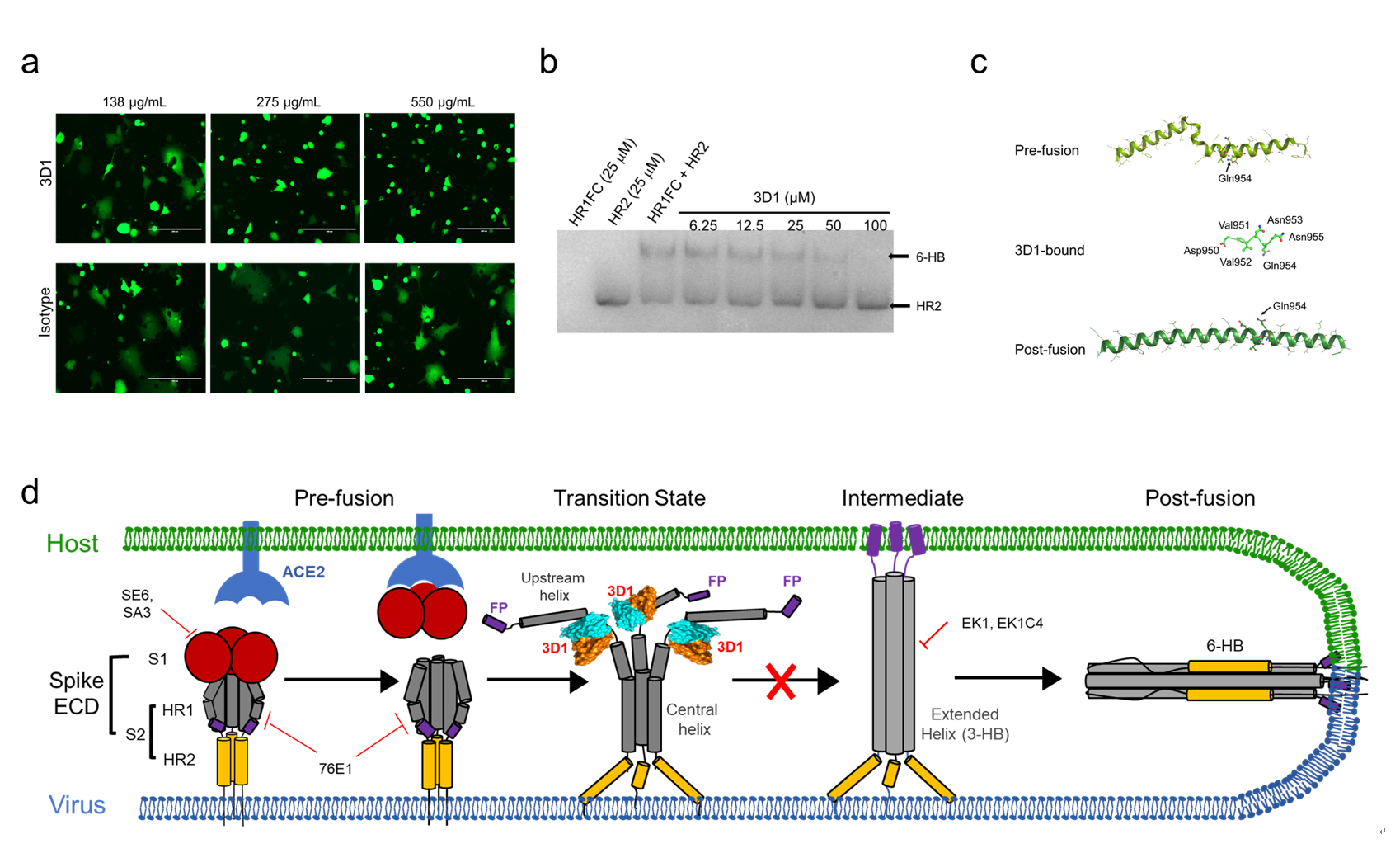 2a. 刺突蛋白-hACE2介导的细胞膜融合实验;2b. 3D1对SARS-CoV-2六螺旋束(6-HB)构象的剂量依赖性抑制;2c. 3D1结合态HR1构象与不同融合态构象对比;2d. 病毒刺突蛋白介导的膜融合示意图。