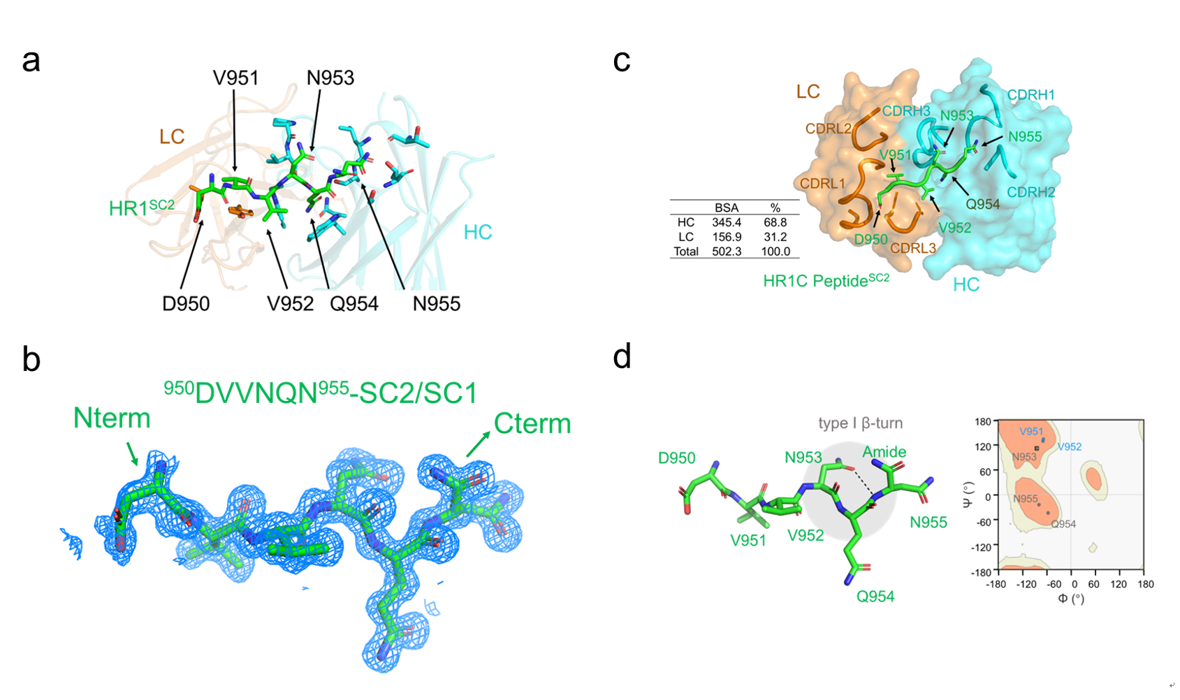 1a. 3D1-肽段复合物整体结构;图1b. 肽段电子密度图;图1c. 重轻链界面互作;图1d. β转角结构特征